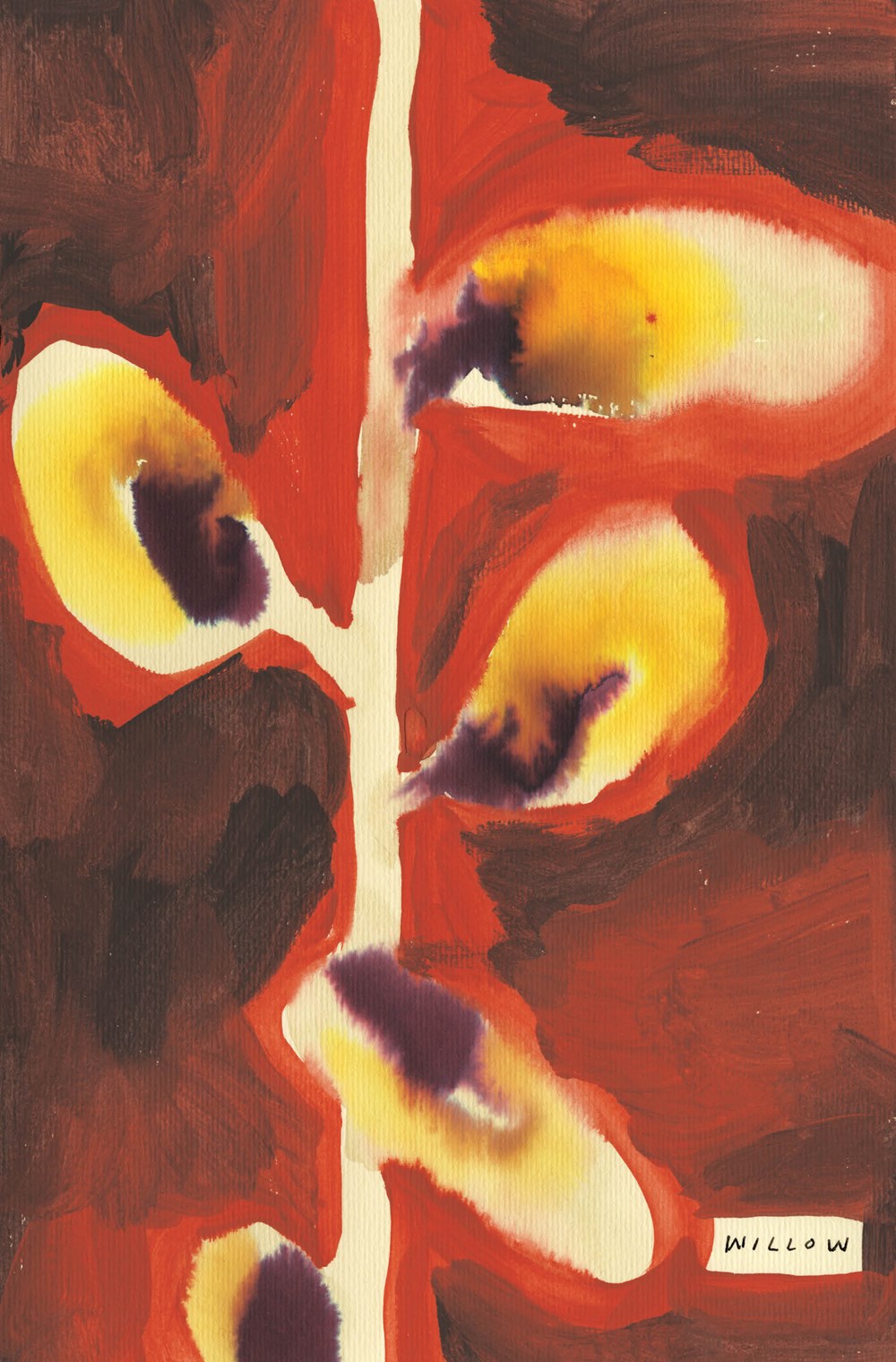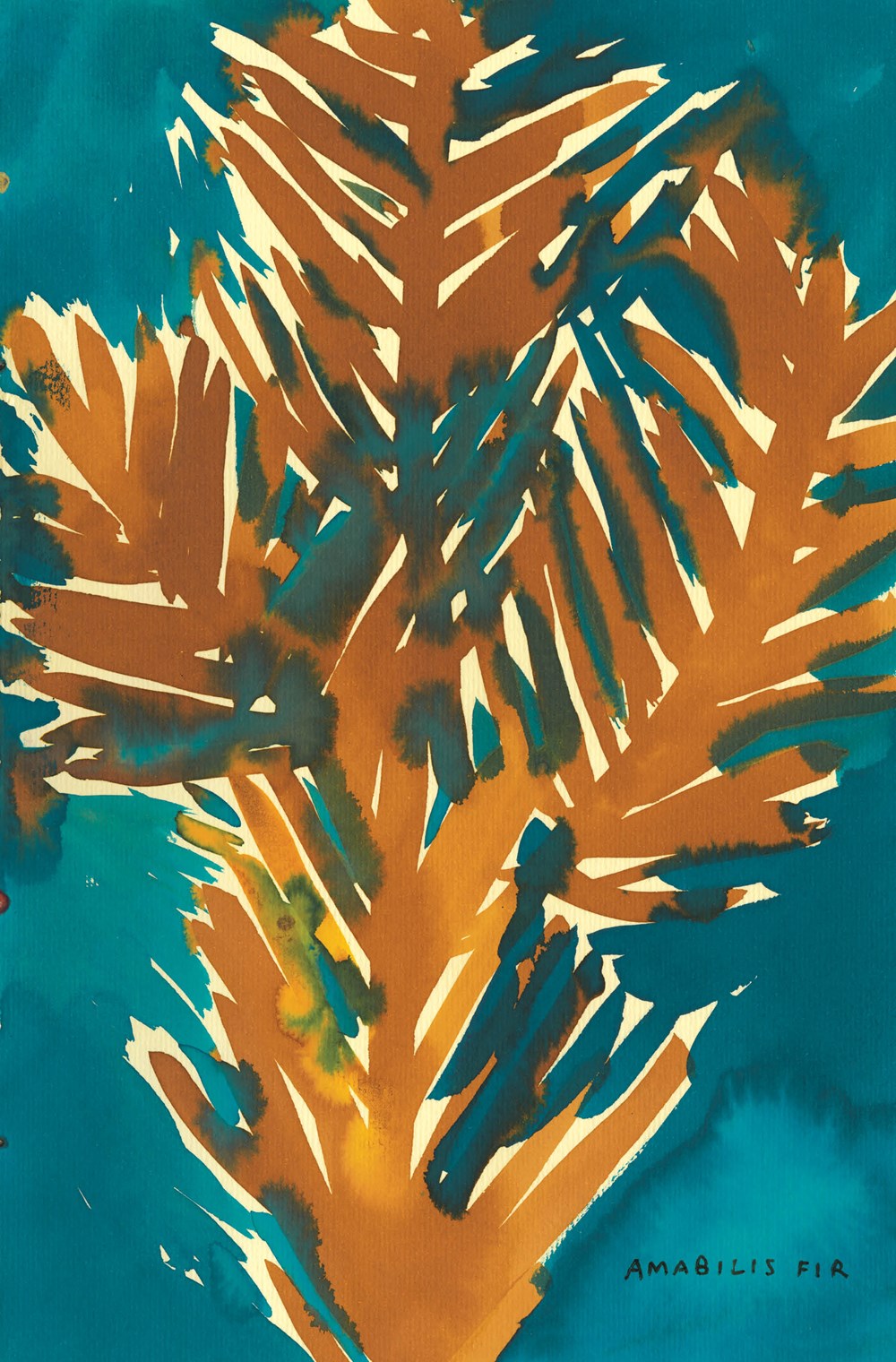 Shapton distills each image into its simplest form, using vivid colors in lush ink and house paint. She takes the otherwise complex objects of trees, pinecones, and seeds and strips them down into bold, almost abstract shapes and colors: the water birch is represented as two pulsating red bulbs contrasted against a gray backdrop; the eastern white pine is represented by a close-up of its cone against a radiant summer sky.