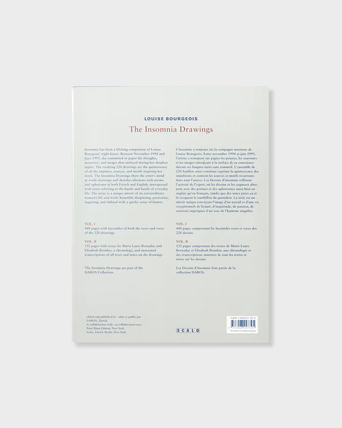 Insomnia was a lifetime companion for Louise Bourgeois (1911–2010). Between November 1994 and June 1995, she committed to paper whatever thoughts, memories and images surfaced during her long, sleepless nights. The resulting 220 drawings are the quintessence of all the impulses, sources and motifs that inspired her work. The Insomnia Drawings shows Bourgeois' total mind at work: drawings and sketches alternate with poems and aphorisms in both French and English, interspersed with notes referring to the hustle and bustle of everyday life. The resulting series is a unique mirror of an extraordinary woman's life and work: beautiful, disquieting, passionate, inquiring and imbued with a quirky sense of humor.