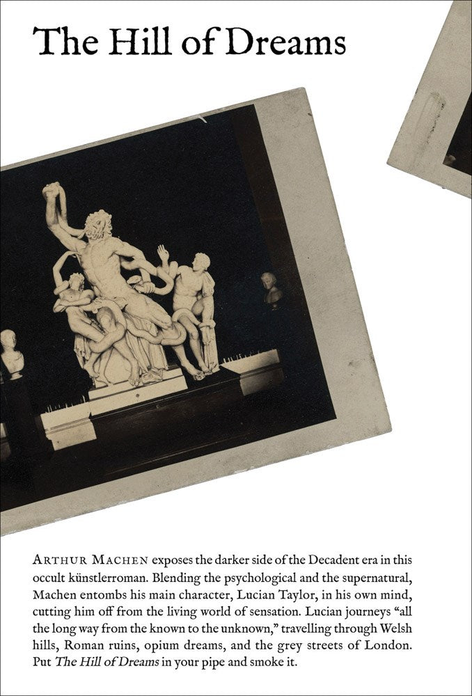 From his earliest literary experimentation, Arthur Machen refused to sit in his own time, clawing his way back to a past inhabited by false gods and terrifying fairies. The Hill of Dreams thus performs a kind of reverse archeology. Instead of the writerly excavation of character development and world-building, Machen entombs his main character, Lucian Taylor, in his own mind, cutting him off from the living world of sensation. Lucian journeys "all the long way from the known to the unknown," into the ruins of an old Roman fort, imbued with the Celtic magic that stirred in the Welsh hills of Machen's childhood. From this idyll, the story becomes a classic künstlerroman, following Lucian to the gray streets of London where he succumbs to his worse nature. Written in 1897 but not published until 1907, the book was, in Machen's own estimation, his masterpiece. All Mandylion books come adorned in a translucent dust jacket that emphasizes the unique material qualities of the book.