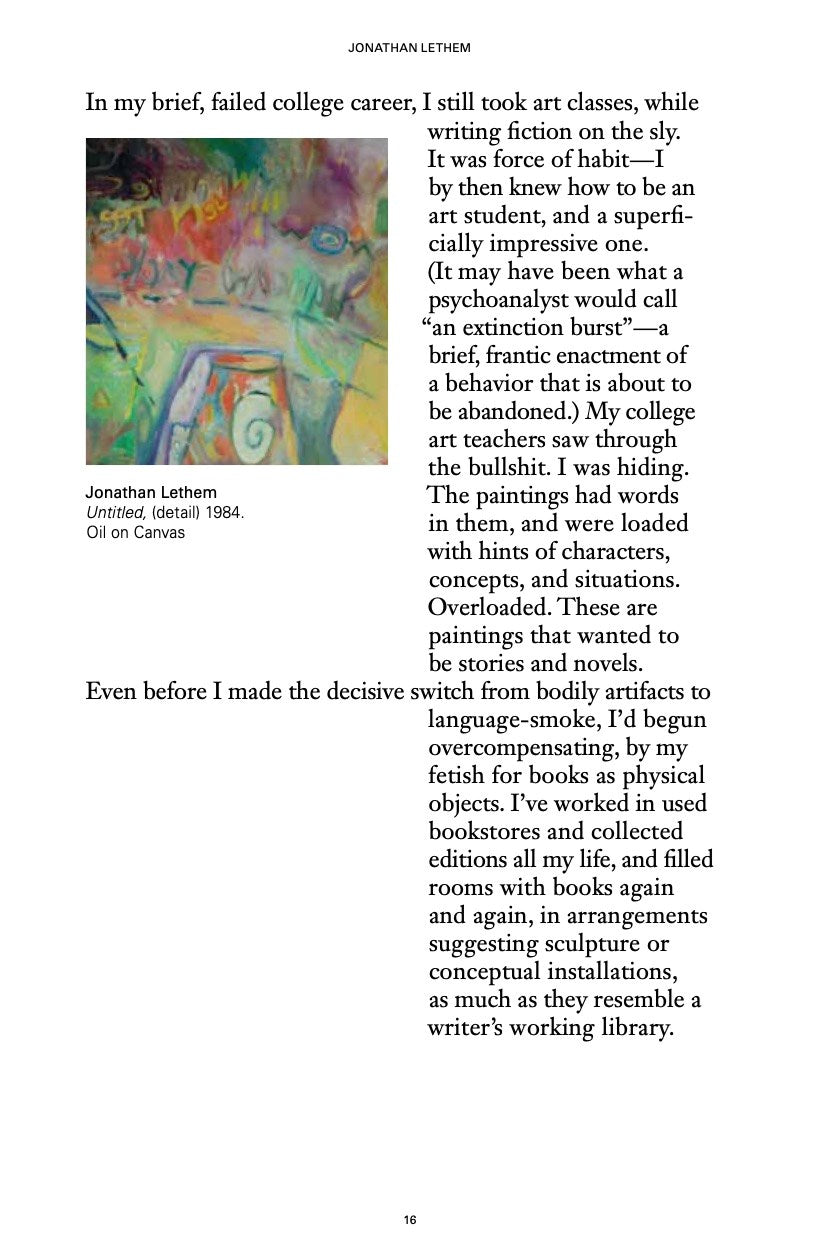 Many know Jonathan Lethem as one of our most celebrated and eclectic writers, whose iconic novels—Motherless Brooklyn, The Fortress of Solitude, Chronic City, among many others—play with genres and storytelling modes like a DJ mixing music. But Lethem grew up in his father’s studio, went to art school, and, in his own words, “made hundreds if not thousands of drawings, collages, paintings, hand-drawn comics, and even two animated shorts” before diverting, at nineteen, to prose fiction. The surreal and form-defying panoply of his stories, essays, and novels celebrates—and mourns—this forsaken world of the visual and plastic arts. That leap, between the cellophane ephemerality of language and the brick-like tangibility of visual art, which operates as a sublimated wellspring for Lethem’s writing, is the subject of this book.