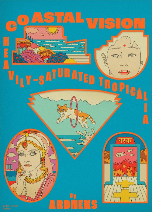 COASTALVISION: Heavily-saturated Tropicália is Jordan, jordan Édition’s first attempt to publish a pure artist’s monograph, featuring the artistic journey of the outsider artist, Kendra Ahimsa aka Ardneks from as far back as 2011 to today. The more-than-a-decade-long journey is presented through a series of interviews between Ardneks and radio announcers from around the globe, blending reality, fantasy, and candid nostalgia; just like Ardneks’ works of art. Ardneks’ body of work is known for its importance in arousing enthusiasm for local concert poster artworks in 2008 – which has attracted the attention of internationally acclaimed bands. Recently, Ardneks has worked with Lollapalooza, Bon Iver, Japanese Breakfast, Khruangbin, New York Times, LA Times, Desert Daze, NANG Magazine, and more.