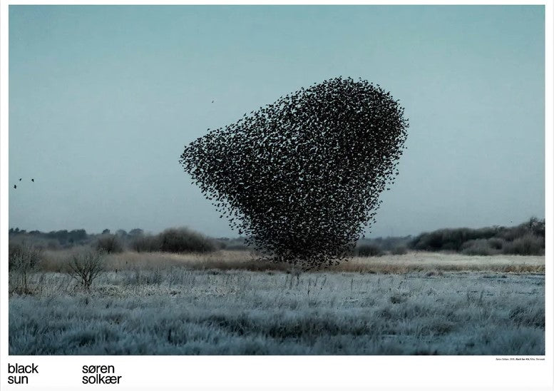 ⁹This beautiful print from Danish photographer Søren Solkær's Black Sun, captures the large murmurations of starlings that take place by the Wadden Sea near his native home of southern Denmark. Following their routes led him on years-long journeys to Italy, the Netherlands, England and Catalonia. Inspired by classical landscape painting, calligraphy and Japanese woodcuts, Solkær presents a series of graphic images featuring landscape and great flocks of starlings, performing an unrivaled display of collaboration and performance skills. These images remind us of ink drawings or calligraphic brushstrokes up in the sky. These images received global acclaim with features in National Geographic, the Observer and the New York Times.