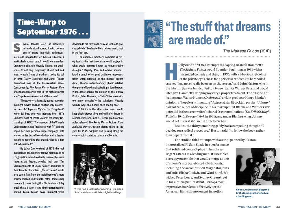 "You Talkin’ to Me?" is a fun, fascinating, and exhaustively reported look at all the iconic Hollywood movie quotes we know and love, from Casablanca to Dirty Harry and The Godfather to Mean Girls. Drawing on interviews, archival sleuthing, and behind-the-scenes details, the book examines the origins and deeper meanings of hundreds of film lines: how they’ve impacted, shaped, and reverberated through the culture, defined eras in Hollywood, and become cemented in the modern lexicon. Packed with film stills, sidebars, lists, and other fun detours throughout movie history, the book covers all genres and a diverse range of directors, writers, and audiences.