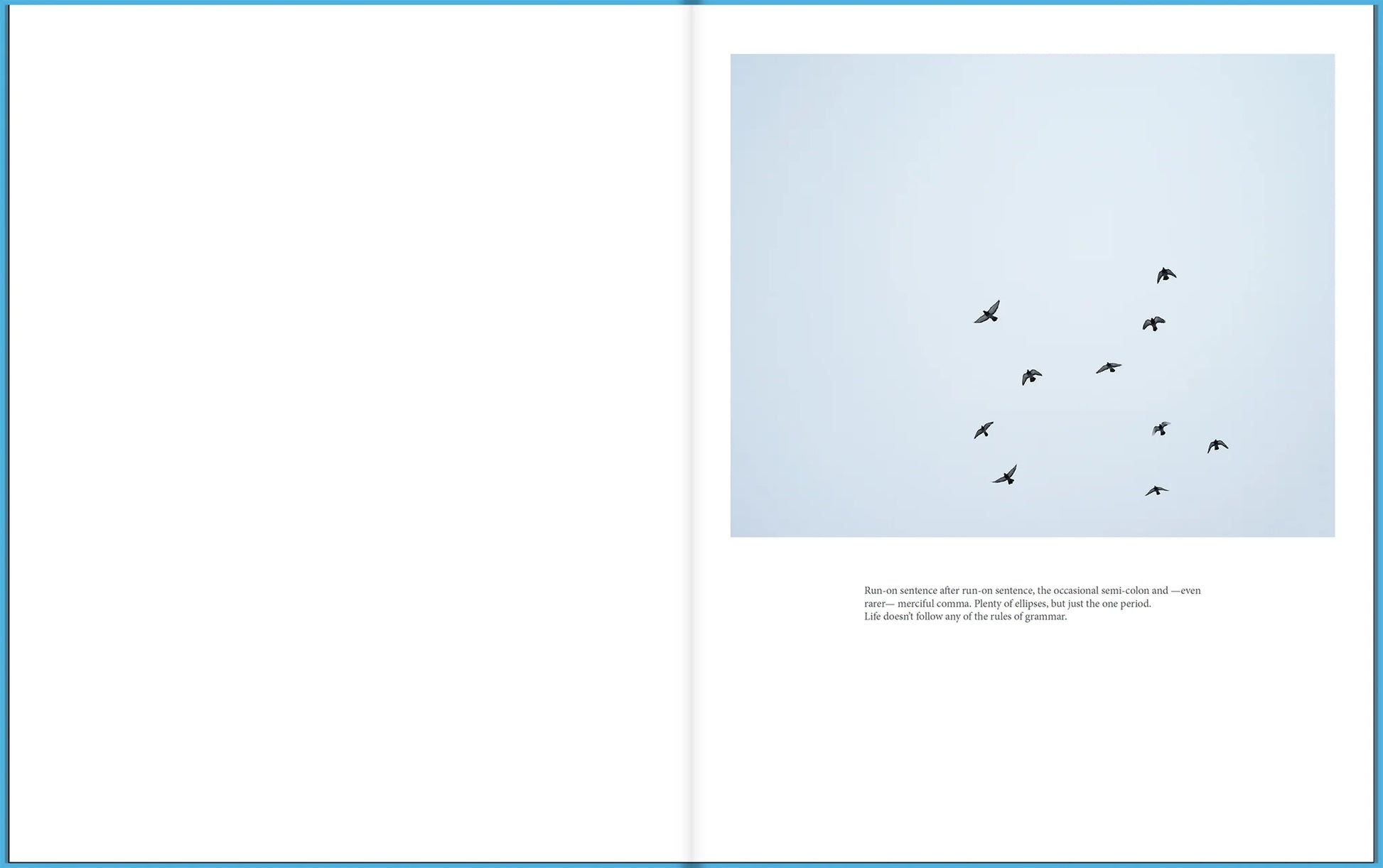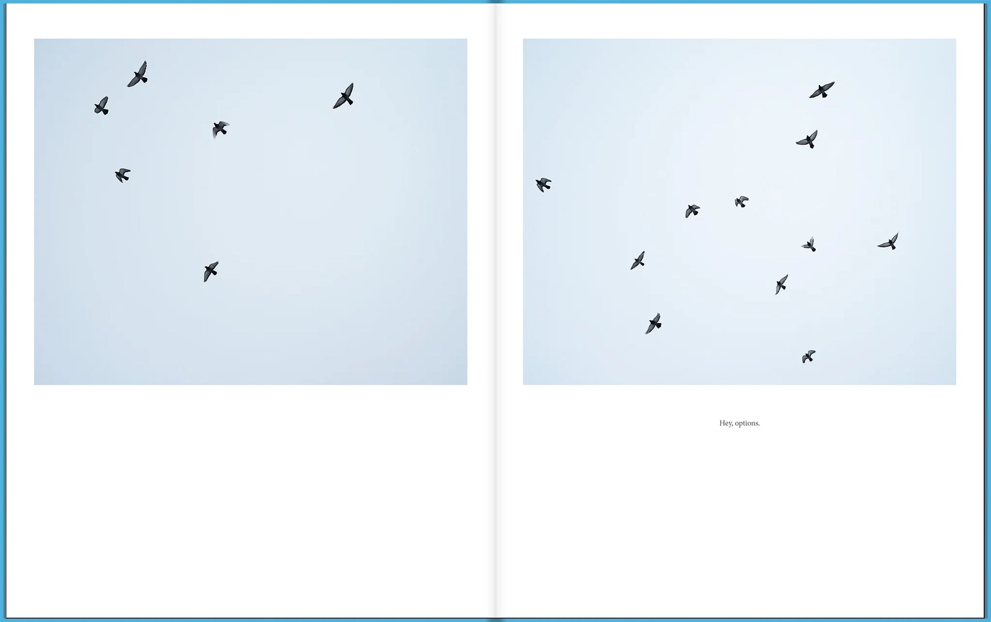 An otherwise charged photograph of birds mid-flight, no doubt bound for a warmer and more hospitable climate is subdued and balanced by the caption “hey, options.”