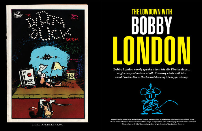 The second issue of dummy looks at several notable examples of unauthorized (and inspired by) Mickey Mouse comics. It includes a deep dive into the notorious Air Pirates, with commentary by Dan O'Neil, Bobby London, Gary Hallgren, Ted Richards, Shary Flenniken and others, as well as rarely seen Air Pirates art and memorabilia. It also has an interviews with Robert Armstrong and his beloved Mickey Rat and Kaz about Creep Rat, and a look at the Mickey Tijuana Bible dirty comics, Wally Wood's X-Rated Disneyland Memorial Orgy poster and even an interview with the legendary artist Stanley Mouse by the great Edwin "Savage Pencil" Pouncey!.