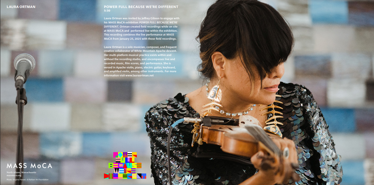 Laura Ortman was invited by Jeffrey Gibson to engage with his MASS MoCA exhibition POWER FULL BECAUSE WE’RE DIFFERENT. Ortman created field recordings while on site at MASS MoCA and performed live within the exhibition. This recording combines the live performance at MASS MoCA from January 25, 2025 with those field recordings.
