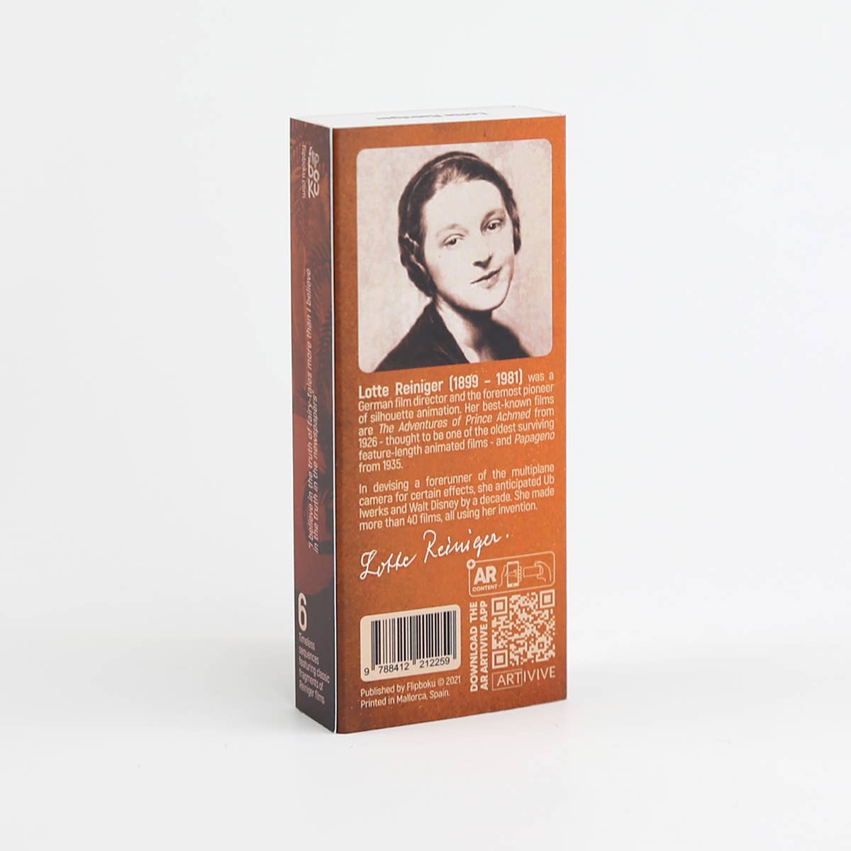 Lotte Reiniger (1899 – 1981) was a German film director and the foremost pioneer of silhouette animation. Her best-known films are The Adventures of Prince Achmed from 1926 - thought to be one of the oldest surviving feature-length animated films - and Papageno from 1935. In devising a forerunner of the multiplane camera for certain effects, she anticipated some of the greatests animators of all time by a decade. She made more than 40 films, all using her invention.