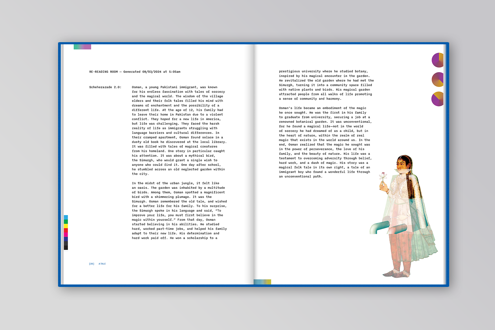 The Thousand and One Nights is framed as a series of stories told by a young woman named Scheherezade to the king Shahryār in order to delay her execution. Each night for 1001 nights, Scheherezade relates the beginning of a tale to the king, who each day postpones her execution in order to hear her tell the end of the story the following evening, along with the start of a new tale. The Thousand and One Nights is the work of many authors: the stories shift with each retelling as they are adapted to new historical and cultural contexts, and shaped by authors’ interests, beliefs, and biases. (For example, “Aladdin’s Wonderful Lamp,” which was adapted for Disney’s 1992 animated film, was not part of the original text.) Road to Hybridabad reflects Khan’s own particular experience of identity formation — which, like The Thousand and One Nights, has been influenced by many histories and cultures–blending American, South Asian, Middle Eastern, and Muslim lores and visual references.