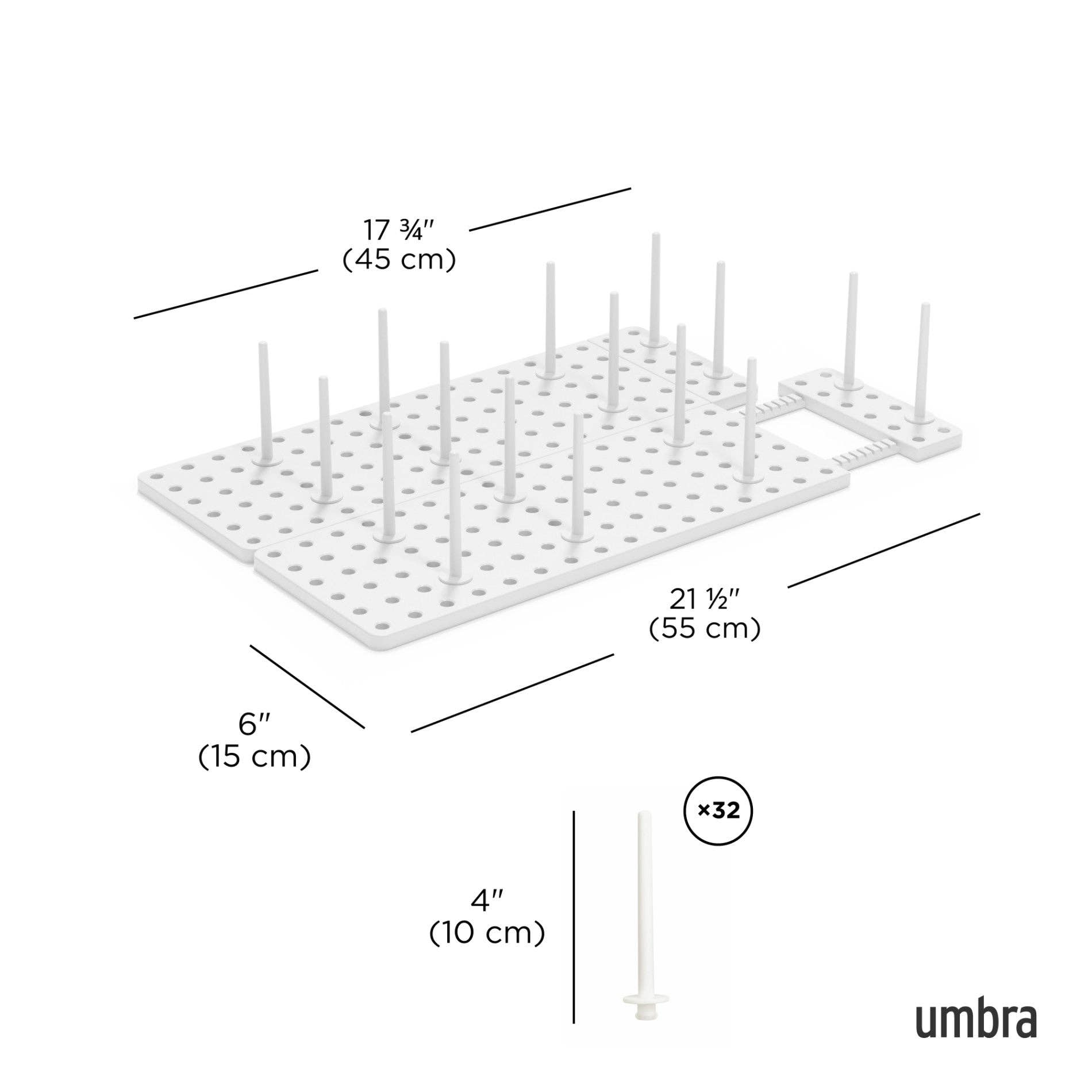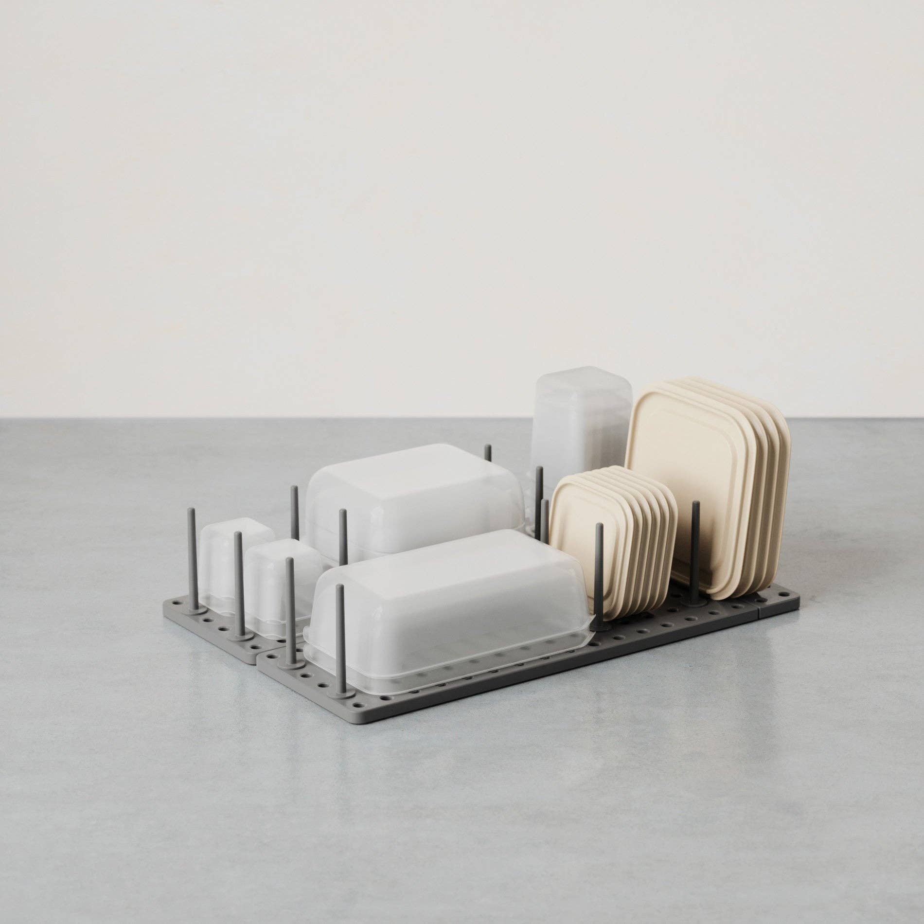 What makes Peggy unique is the adjustable tray and removable pegs that can be repositioned at any time. You choose where to place them based on your needs which means you can create the perfect fit to accommodate your plastic food storage containers and lids, your mixing bowls, your cooking utensils and just about anything else you want to keep organized and in its place. With a matrix of 108 holes and a total of 32 pegs included, there's literally hundreds of available configurations which means nearly limitless storage possibilities. To ensure a perfect fit, each base can be extended up to an additional 3.25 inches and comes equipped with non-slip feet to ensure Peggy stays put. Measures 21.5 x 6 x 4 inches (55 x 15 x 10 cm). Made with recycled plastics. Recommended for lightweight dishware.