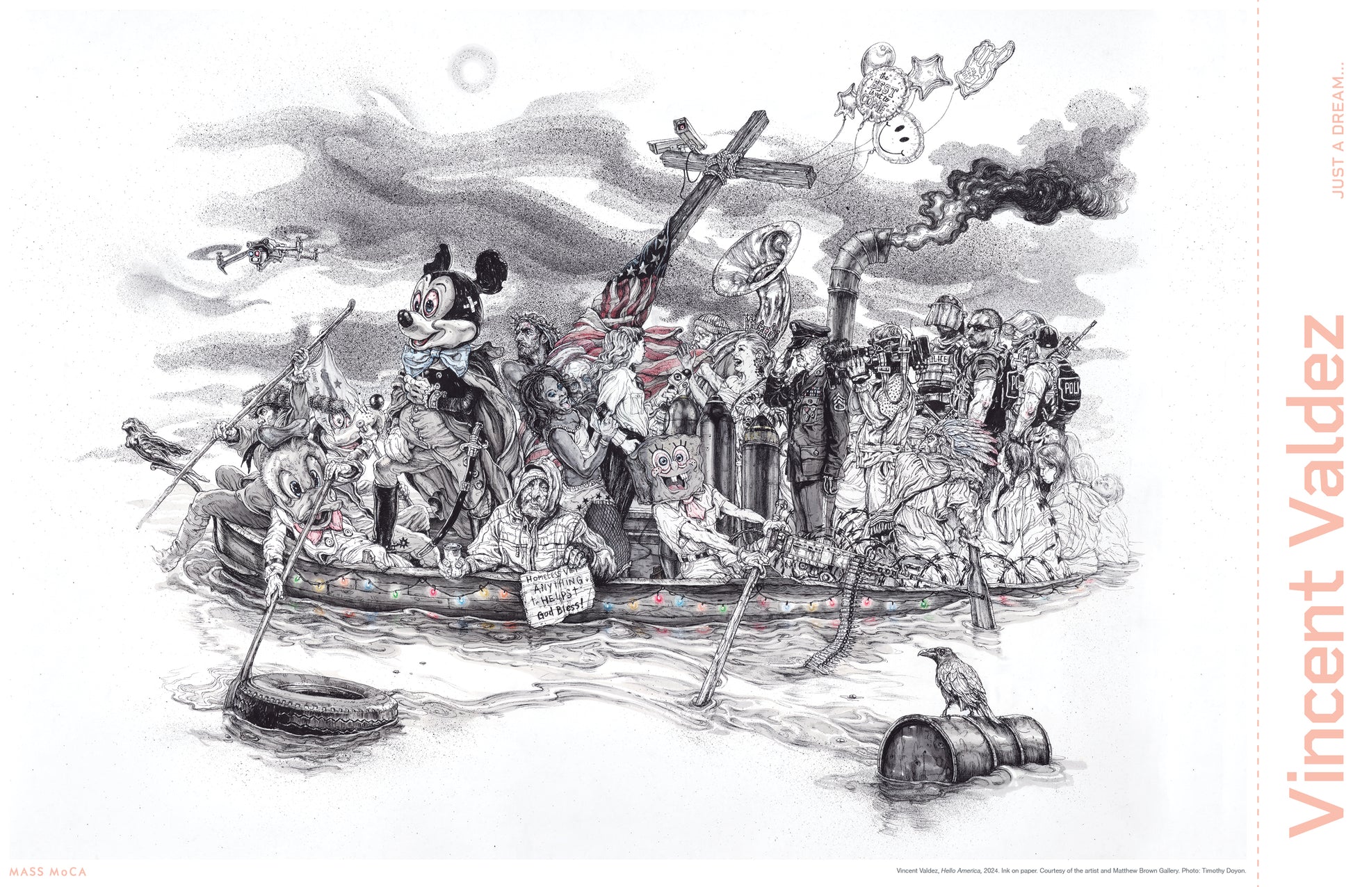 A centerpiece of Vincent Valdez' retrospective exhibition, Just A Dream...Hello America re-envisions Emanuel Leutze’s Washington Crossing the Delaware (1861).