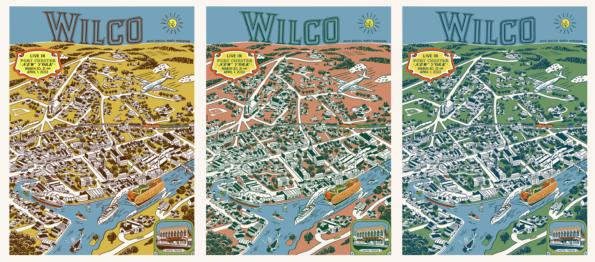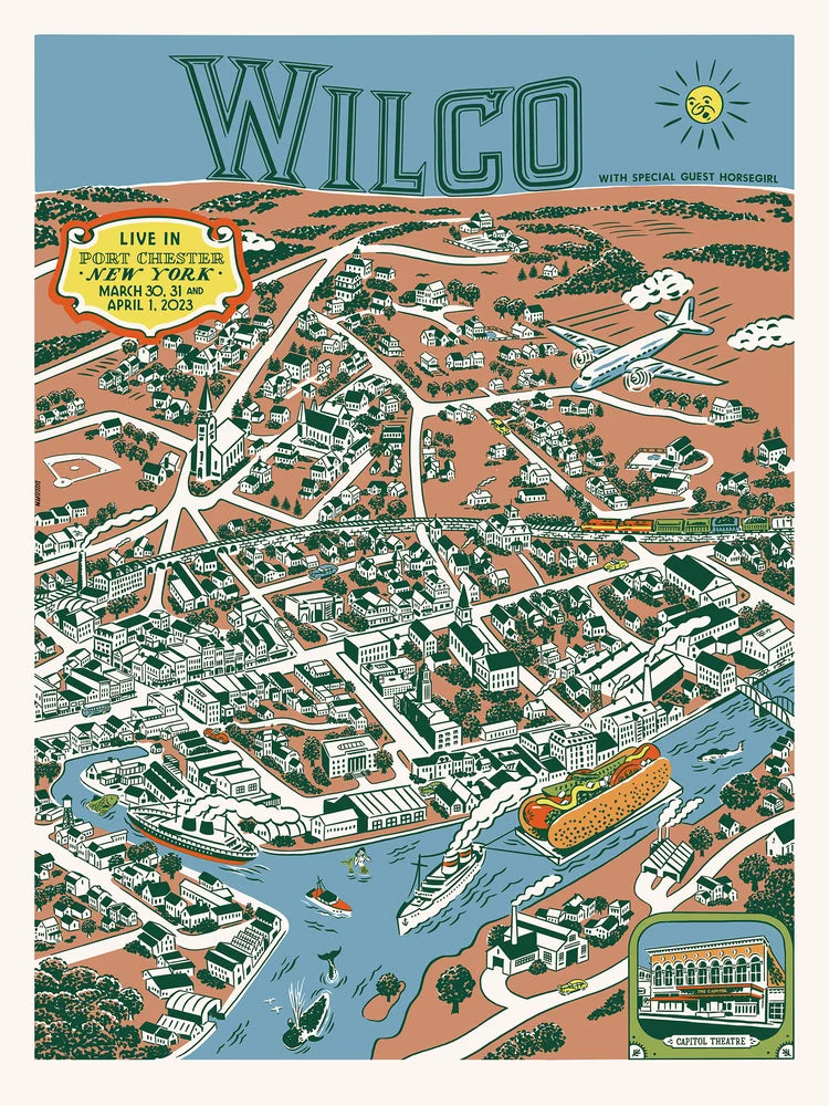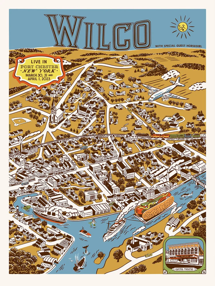 5 color screen print for Wilco's three-night run at The Capitol Theatre in Port Chester, NY. Poster is printed on cover weight Cougar natural paper stock. 18" x 24" for easy framing.