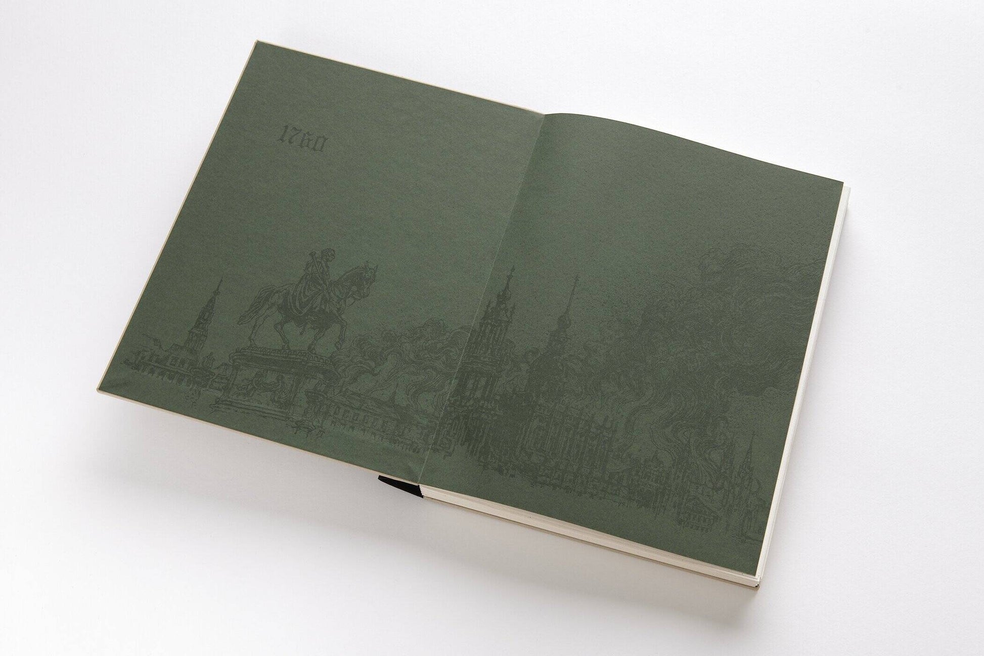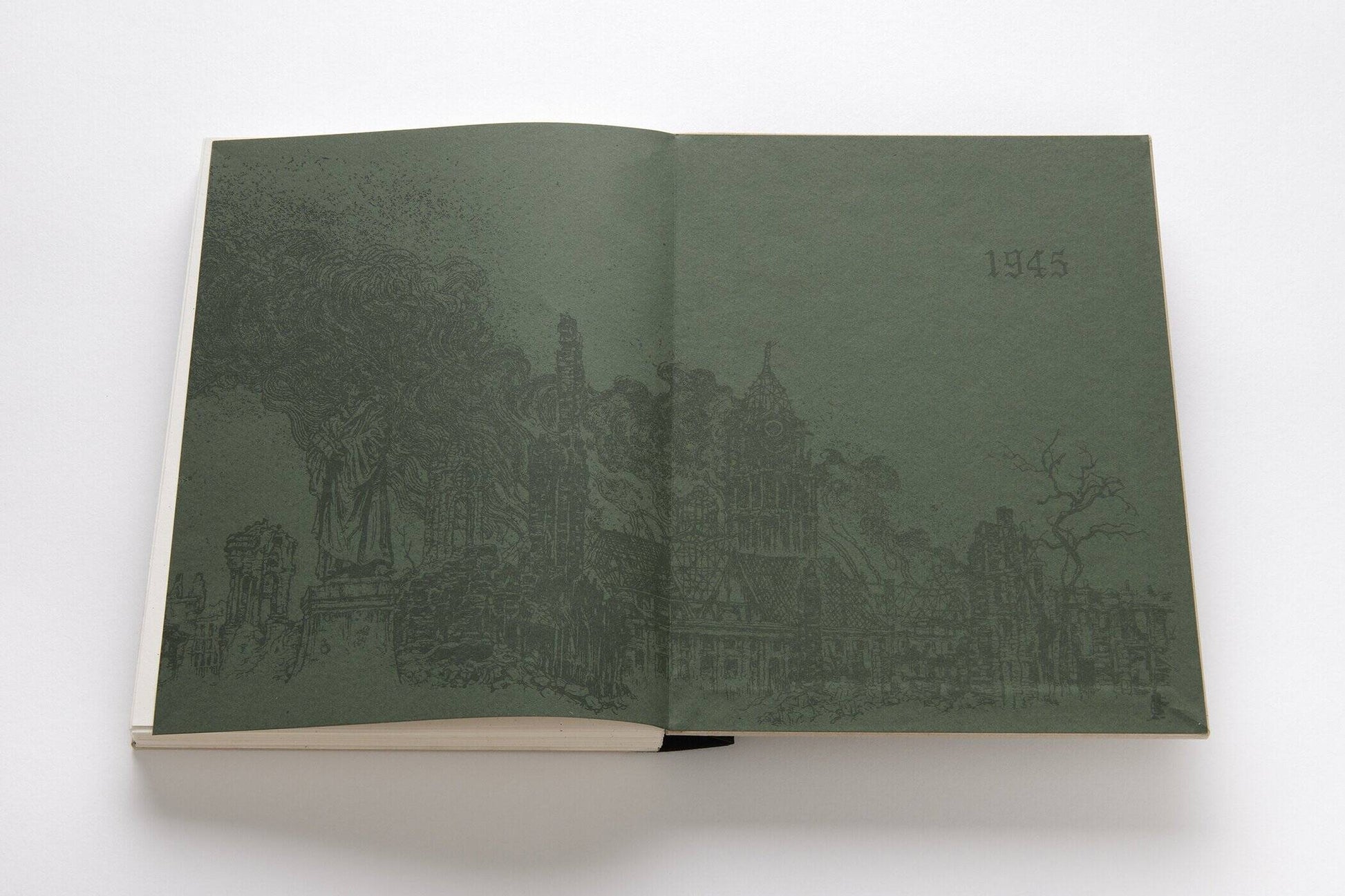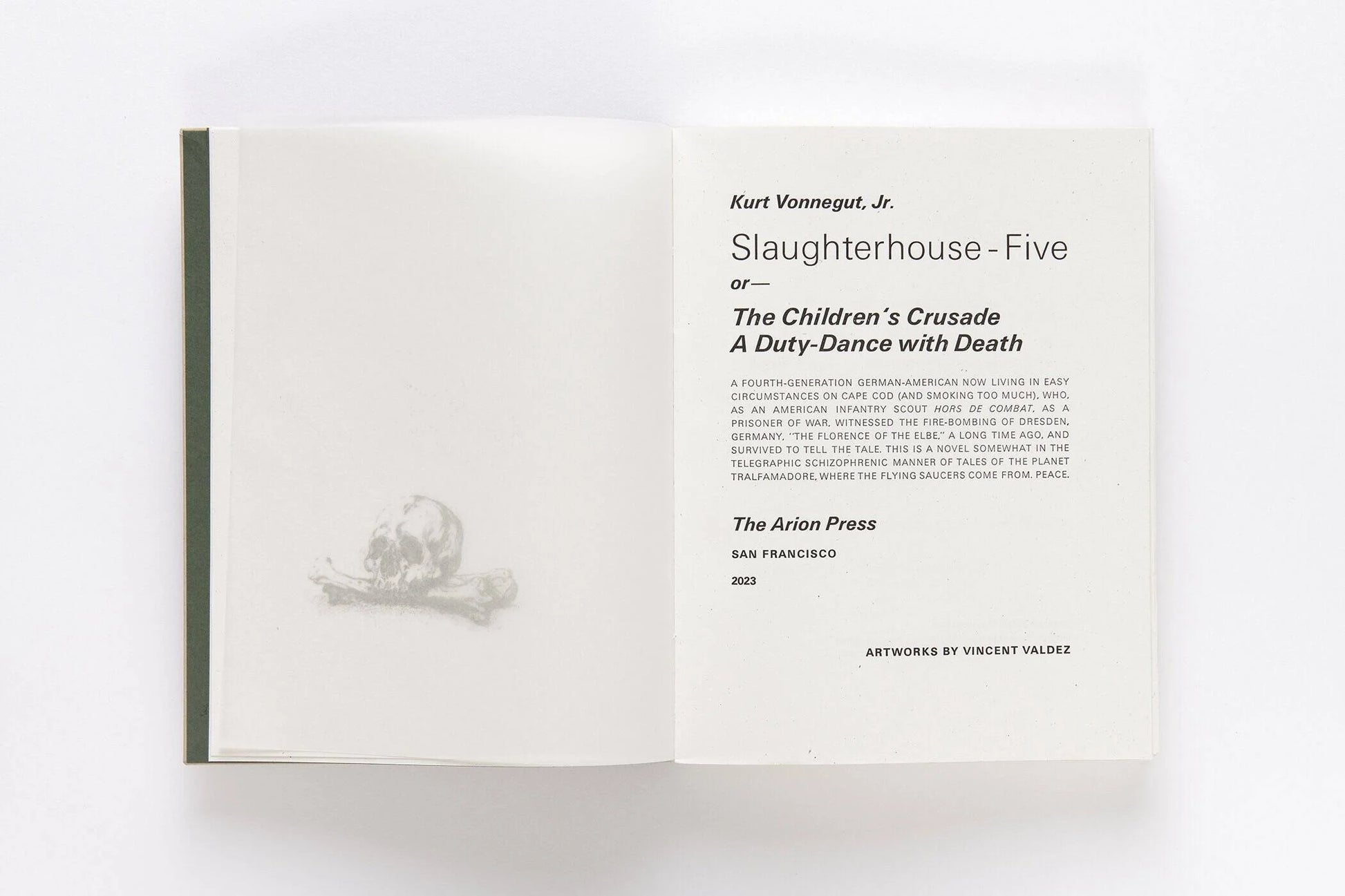 Arion Press is proud to collaborate with acclaimed artist Vincent Valdez to present Vonnegut’s Slaughterhouse-Five. Valdez has created 20 original pen-and-ink drawings—many enlivened with ink washes—to bring Vonnegut’s anti-war classic roaring to contemporary relevance. Two sweeping depictions of the destruction of Dresden in 1760 and 1945 appear on the front and rear end sheets of the Arion edition. The full suite of drawings reflects Billy Pilgrim’s fractured psychological landscape as well as the external collective psychosis of a world engaged in perpetual warfare. Altogether, the body of work coalesces into what Valdez calls a “visual testimony of transformation, hope, love, and survival in 21st-century America.”