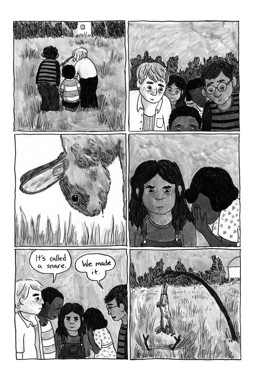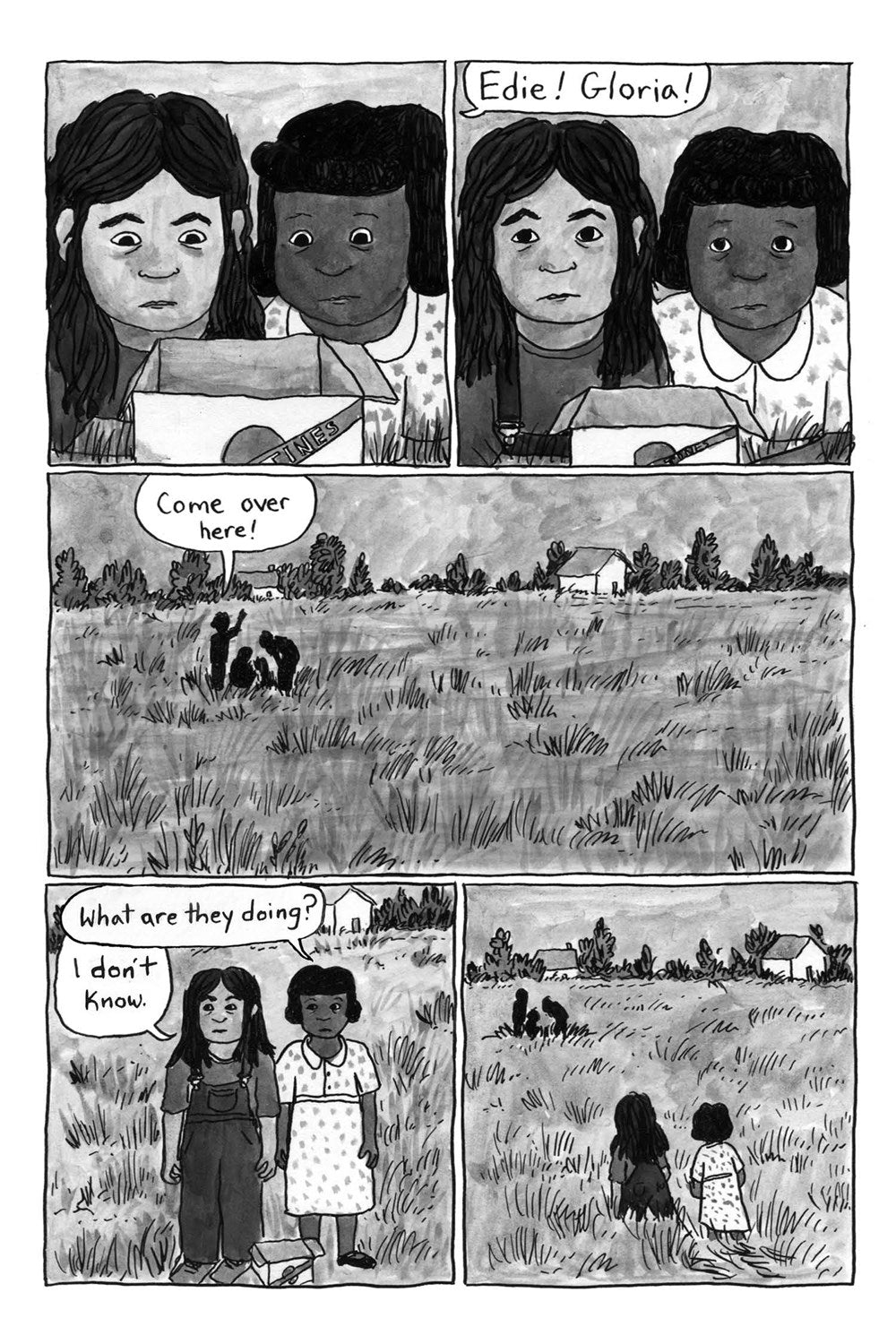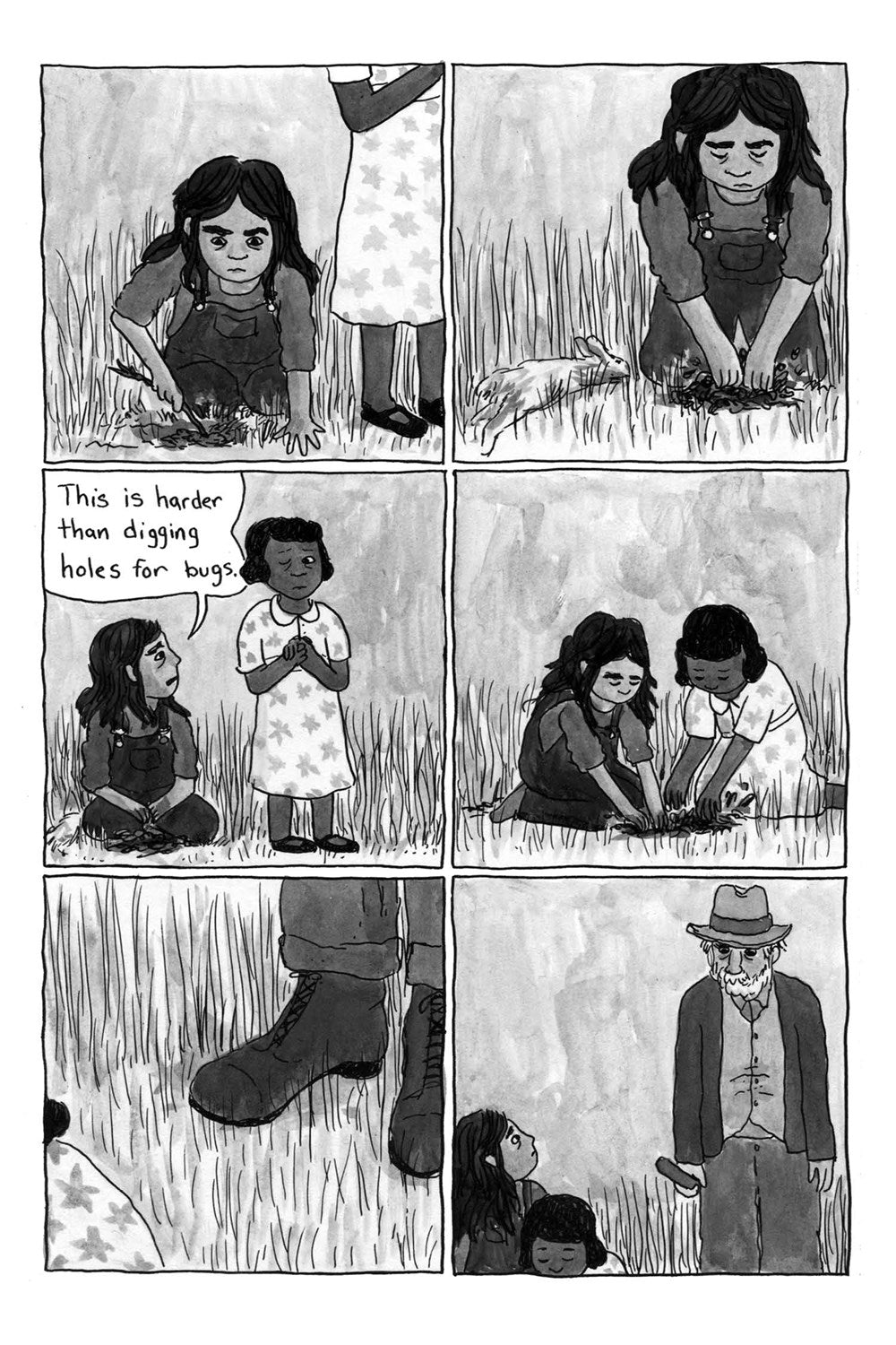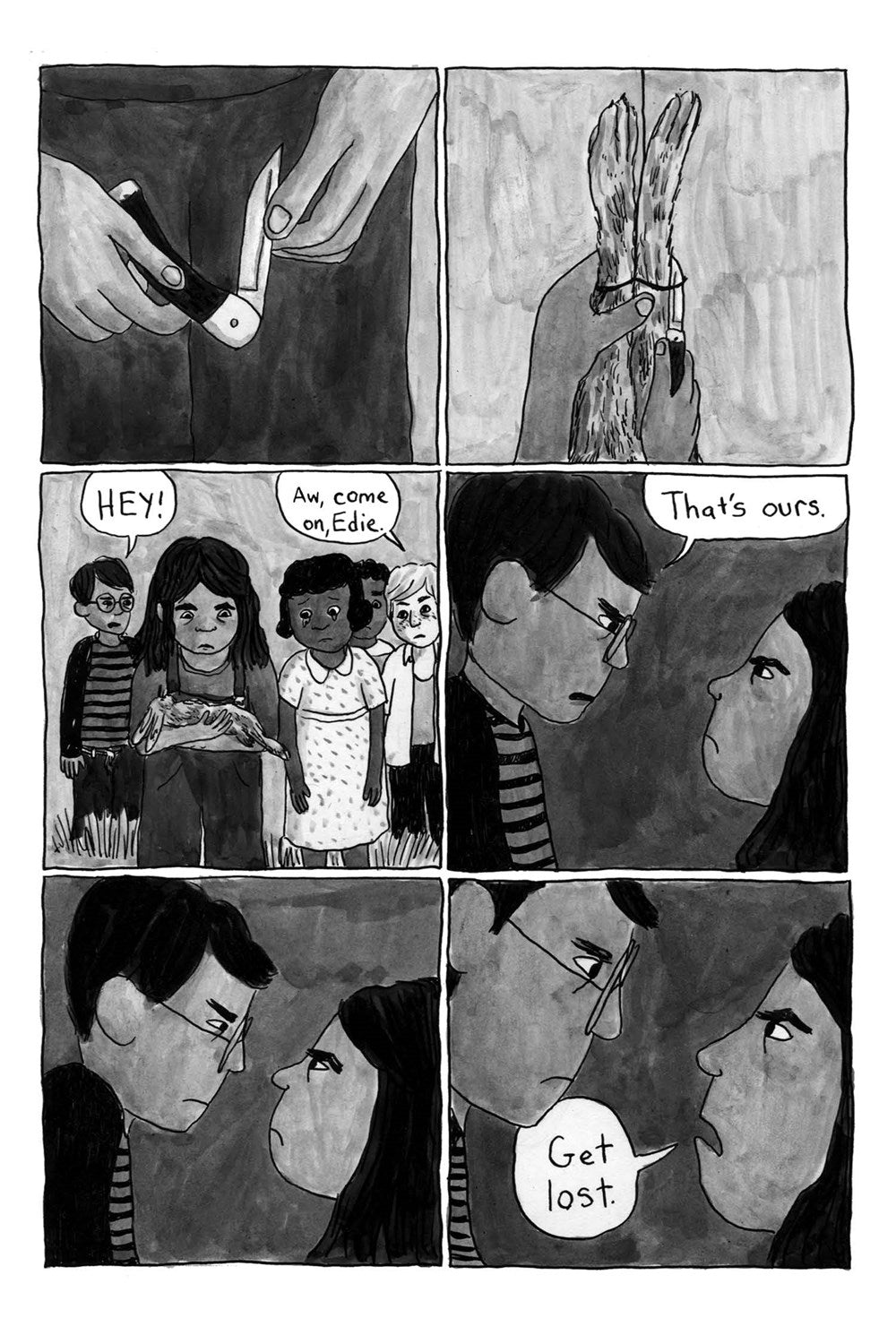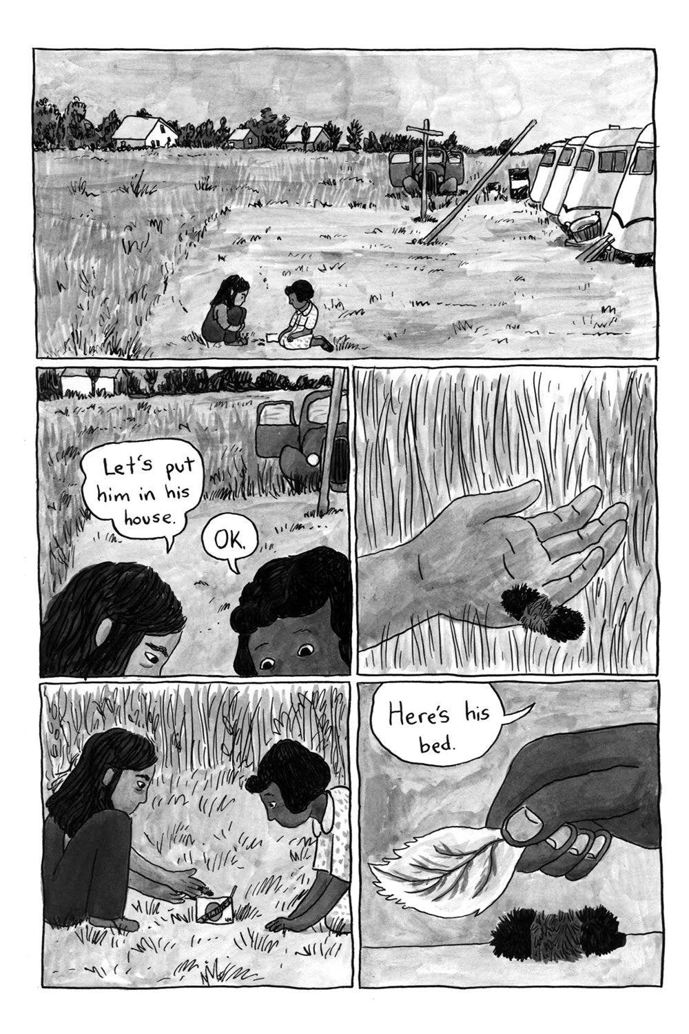 Melissa Mendes’ pastoral cartooning captures the openness of rural America—soft breezes, tall grass, whirring grasshoppers, rainstorms, skinned knees. But all the while, the cruelty, the disappointment of man lurks behind the barn and in the trailer. Life can be stubbed out as easily as a cigarette tossed in the dirt. One moment all focus, next, gone without a thought. Will Edie find herself repeating a cycle or will she be free like she felt as a child?