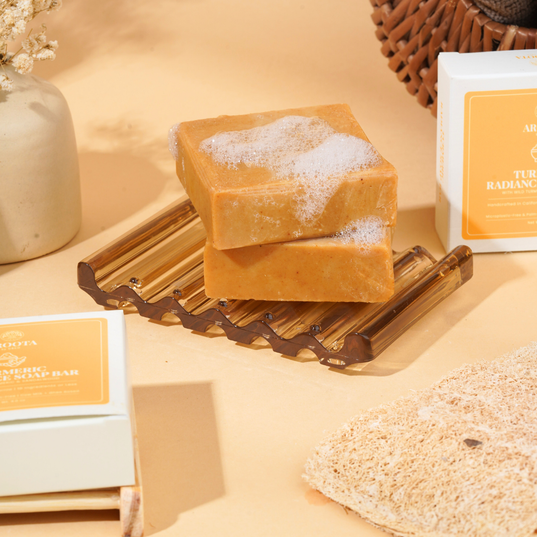 Aroota Turmeric Soap is a handcrafted Ayurvedic cleansing bar formulated with turmeric and supportive botanicals to gently cleanse, soothe inflammation, and promote a healthy, radiant glow.